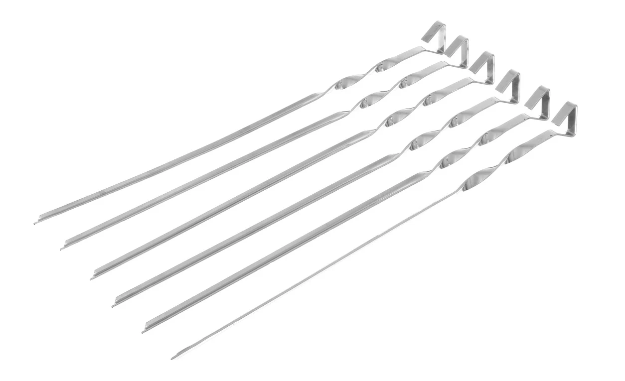 Кількість в наборі 6 шт. Розмір 45*1*0.2см. Призначення: використовувати для приготування м’яса, риби, птиці, овочів на відкритому вогні. Завдяки гвинтованим ручкам шампур фіксується на мангалі. Виготовлені з високоякісної сталі, яка не іржавіє та не окислюється при контакті з їжею чи водою.
